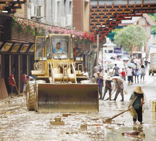 9月2日,巫溪县城,工人在清扫洪水消退后的街道。通讯员 谢道玖 摄