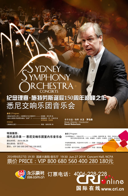 国际在线专稿:2014年6月,美国当今人气指挥家大卫·罗伯森将率领悉尼交响乐团首次访华巡演,本次巡演的独奏由新生代天才钢琴家张昊辰担纲,他们将在北京、上海、广州、深圳、西安五个城市为热爱音乐的朋友献上一场纯正的交响盛宴!特别值得一提的是,6月26日至27日,罗伯森将携悉尼交响乐团在国家大剧院连续演奏两场,第一场主题为“现代启示录”,另一场主题则是“纪念理查施特劳斯巅峰之作”,令人非常期待!