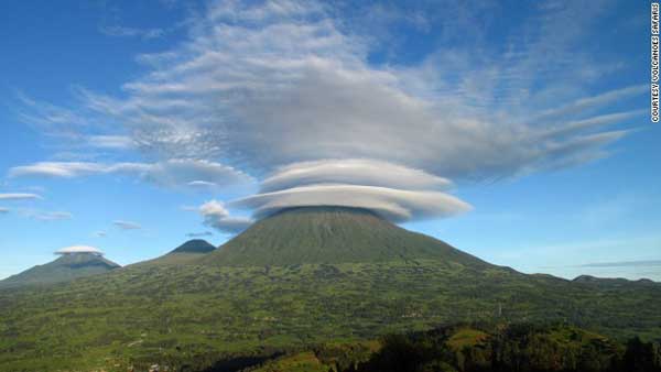 维龙加山脉是位于东非的火山群,由8座主要火山组成,是东非大裂谷的一部分。若有气流被抬升上山,气流遇冷后便会在山顶上形成形状奇特的云层,仿佛给山群带上了一顶“云帽”。此外,维龙加山脉也是山地大猩猩的栖息地。