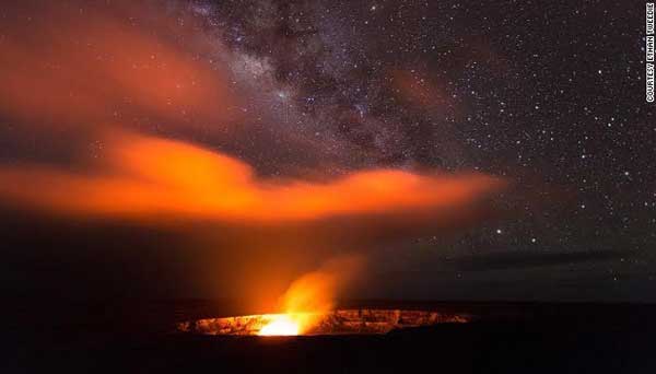 基拉韦厄火山位于美国夏威夷火山国家公园,海拔约1280米,直径4027米,深130余米。这里曾长期存在着一个世上最大的岩浆湖,面积广达10万平方米,通红织热的岩浆在湖中翻滚嘶鸣,仿佛一炉沸腾的钢水。晚上,熔岩湖色彩变得更加炽热浓烈,在夜空中映照出一片焰色。