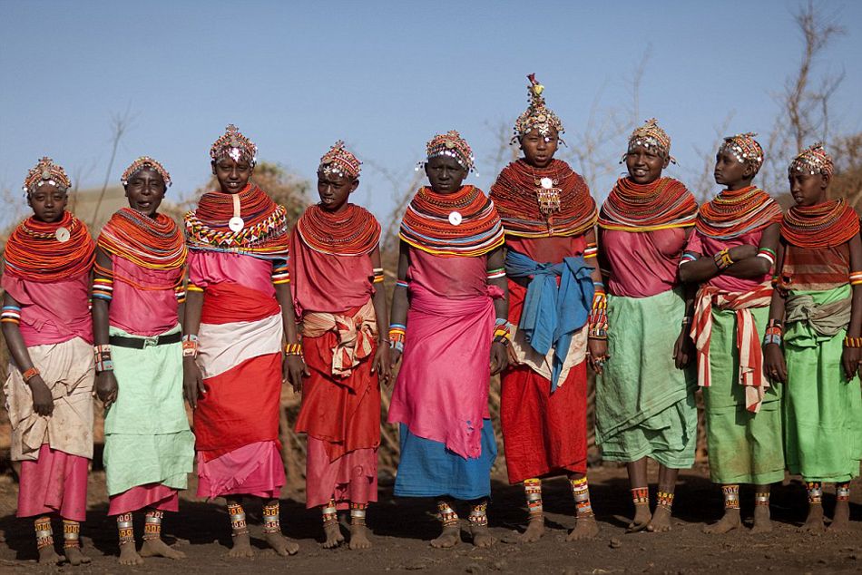 据英国《每日邮报》7月18日报道,居住在肯尼亚北部东非大裂谷的桑布鲁人(Samburu)和朗迪耶人(Rendille)都十分喜爱鲜艳的珠子做的装饰品。女人们脖子上戴着珠子项链,手臂上戴着珠子手镯。摄影师埃里克·拉福格(EricLafforgue)说这些珠子做的项链不仅美观,而且能显示女人的婚姻状况、健康状况甚至是她们孩子的数量。