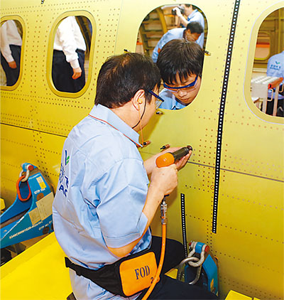 为此,在飞机各大部段研制过程中,中国商飞积极推进项目组织变革,组建技术、工艺、制造联合工程团队,攻克关键技术,提高研制效率。在中国商飞总装制造中心,承担机体结构对接工作的部装厂房,由中央翼装配、中机身装配、水平尾翼装配和全机对接4条生产线组成;这4条生产线采用了自动化制孔、钻铆设备、自动测量调姿对接系统、自动引导运输车、飞机移动系统等先进设备,是具有国际先进水平的民机部件自动化装配生产线,使得装配效率和质量大幅提升。